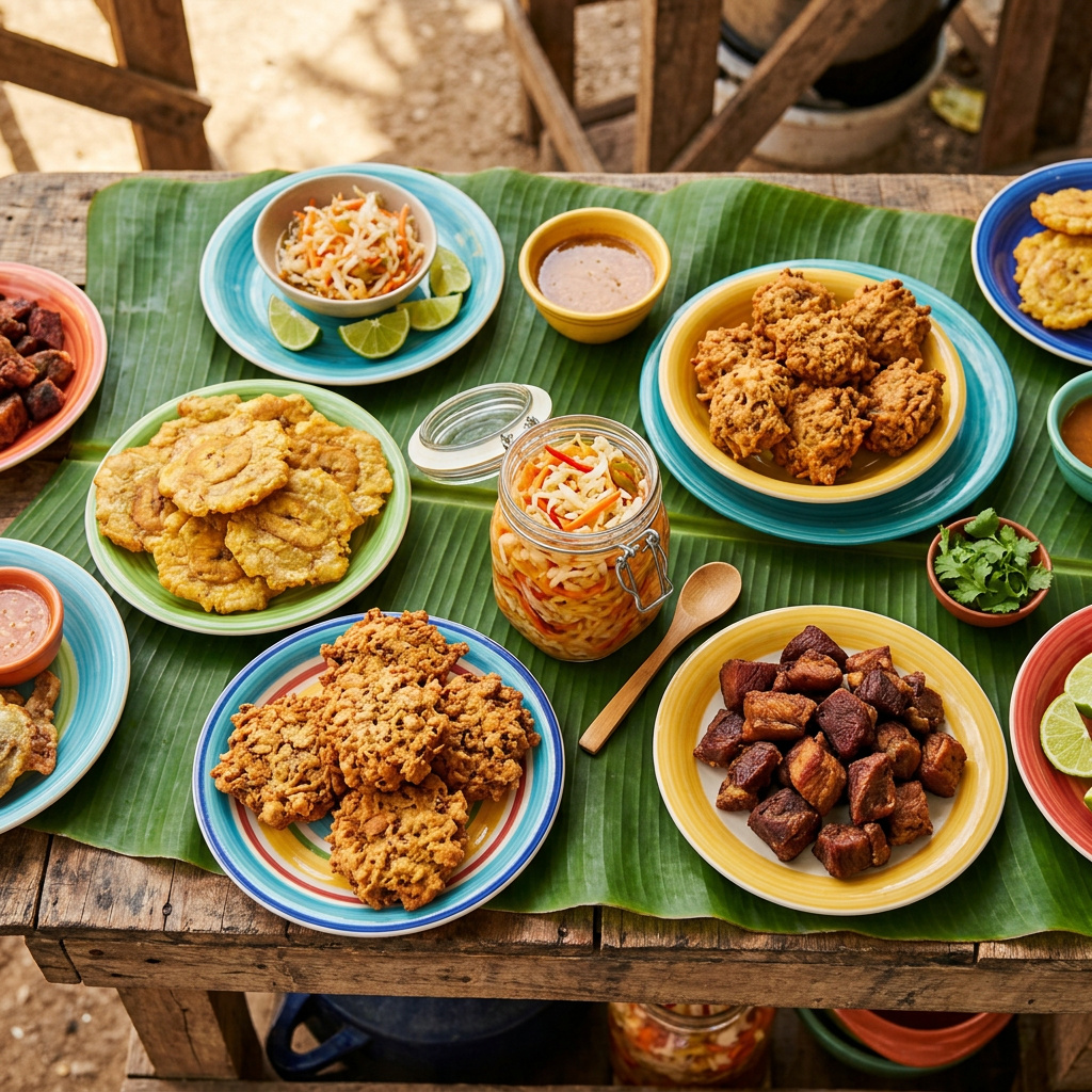 In Haiti, there are restaurants with menus and tablecloths, but the true culinary heart of the nation beats at the fritay stand. The word fritay — from the French friture, meaning fried food — refers not to a single dish but to an entire category of street food: a glorious, communal spread of fried delights served together on sheets of brown paper or shared plates. A typical fritay platter might include griot (fried pork), tassot (fried goat or beef), bannann peze (twice-fried plantains), akra (malanga fritters), marinad (savory batter fritters), and always, always, a generous helping of pikliz — the incendiary pickled relish that ties everything together.