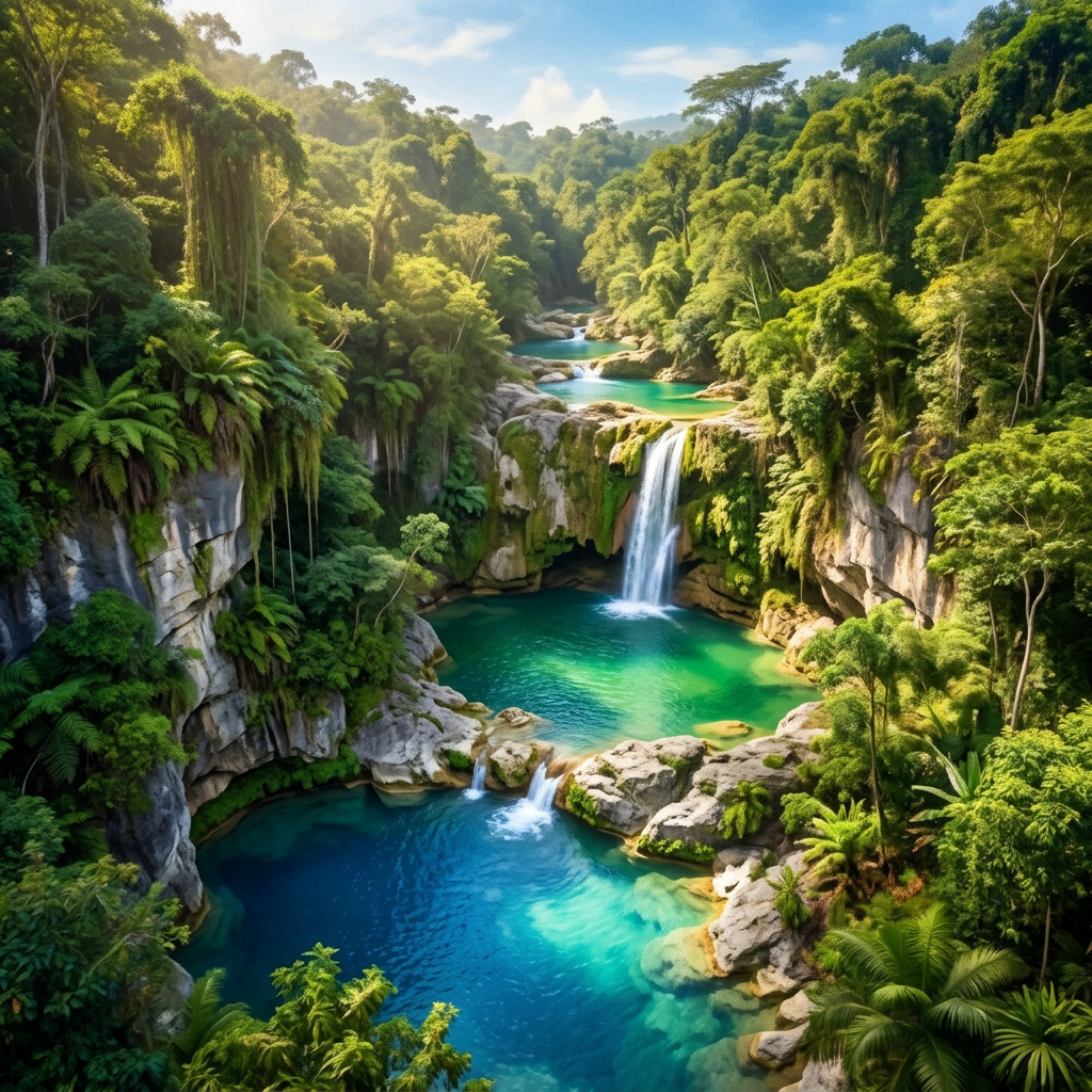 Bassin-Bleu is not one pool but a series of four natural basins, each fed by waterfalls and connected by limestone channels worn smooth over thousands of years. The site is a karst formation — a geological phenomenon where slightly acidic water slowly dissolves the limestone bedrock, creating hollows, caves, and underground rivers that eventually surface in pools of extraordinary clarity.